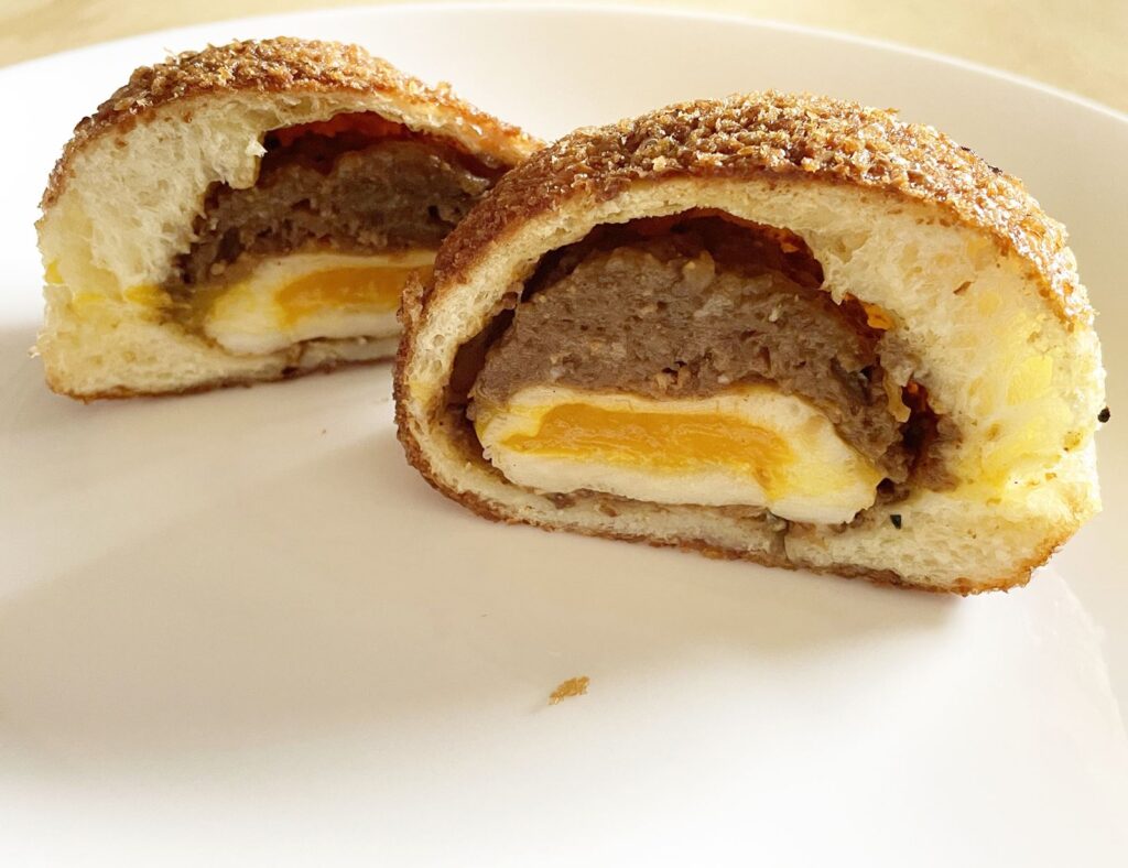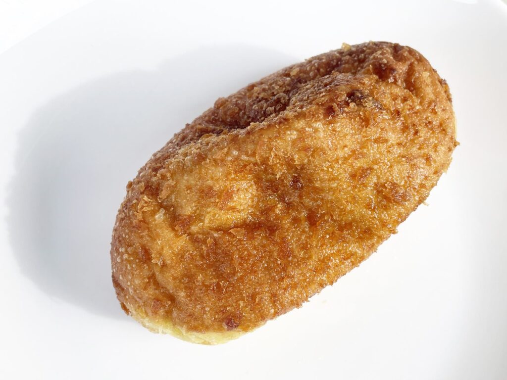 キーマーカレーの肉ダネに半熟卵が丸ごと1個入ったカレーパンです。