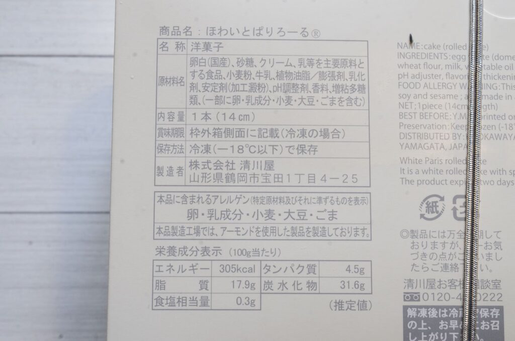 卵白(国産)、砂糖、クリーム、乳等を主要原料とする食品、小麦粉、牛乳、植物油脂など